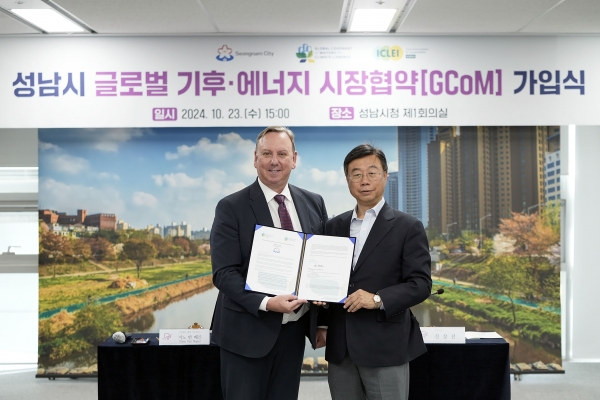 시는 이날 오후 3시 시청 4층 제1회의실에서 신상진 성남시장과 지노 반 베긴(Gino Van Begin) 이클레이 세계사무총장, 박연희 이클레이 한국사무소장 등이 참석한 가운데 ‘성남시 글로벌 기후·에너지 시장협약’을 진행하고, 지콤 가입을 공표했다. 이에 따라 성남시는 2년 이내에 지역에서 발생하는 온실가스 인벤토리를 등록하고 ▲도시 기후 위기 취약성 분석·평가 ▲온실가스 감축 목푯값 설정 ▲기후 행동 계획 수립 ▲에너지 접근계획 수립 등을 이행하게 된다.이중 온실가스 인벤토리는 건물, 도로 수송, 폐기물 등 온실가스 배출원을 규명하고, 각 배출원에 따른 배출량을 산정해 놓는 것으로 감축 목표의 기준이 된다.이행 과제를 달성하면, 지콤 측이 제공하는 ‘기후행동 이행 배지’를 받는다. 인증 배지를 받은 도시는 국제사회와 연계해 기후 위기 대응을 선도하는 도시로서 활동할 수 있게 돼 국제적 위상이 높아진다.