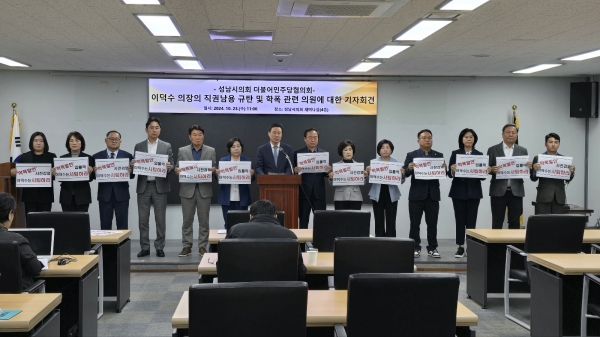 [광성일보] 성남시의회 더불어민주당의원협의회는 기자회견을 통해 존경하는 시민 여러분,오늘 저희 성남시의회 더불어민주당협의회 의원 일동은 성남시의회의 명예와 위상을 지키기 위한 중대한 결단을 내리고 이 자리에 섰습니다.금일 진행된 제297회 임시회 1차 본회의에서 이덕수 의장은 더불어민주당 소속 의원들의 5분 자유발언을 부당하게 제한하는 직권남용을 저질렀습니다.이준배 대표의원과 성해련 의원이 준비한 발언문에 '학교폭력'이라는 단어가 포함되었다는 이유로, 이덕수 의장은 발언을 불허했습니다. 학교폭력이 시정과 관련이 없다는 자의적인 판단에 따라 발언을 차단한 것입니다.
