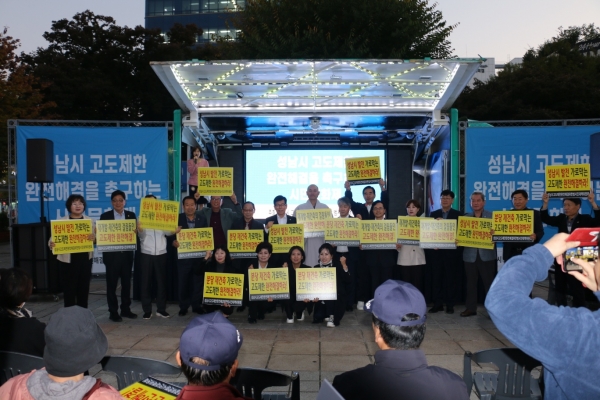 시민발언대에 나선 김정수 탑마을 선경아파트 재건축 추진준비위원회 위원장은 “정부가 추진중인 1기 신도시 선도지구가 추진되고 있는데 야탑동 일대에 적용되고 있는 고도제한이 완화되지 않고서는 분당재건축은 불가능하다”면서“국방부는 더 이상 더 이상 분당주민들의 고통을 주는 고도제한 완화에 나서야 한다”고 비판했다.김은경 김은경 수진2구역재개발조합설립준비위원회 위원장도 “재개발을 목적에 두고 있는 수진2구역도 고도제한이 해결되지 않으면 주민들의 희망인 재개발은 불가능 하다”면서“50년 넘게 피해를 보고 있는 수정구와 중원구에 대한 고도제한은 현실에 맞게 완화되어야 한다”고 말했다.
