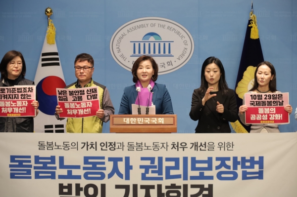 [광성일보] 이수진 국회의원(더불어민주당, 성남 중원)과 노동시민단체가 29일, ‘국제 돌봄의 날’을 맞아 국회소통관 기자회견장에서 「돌봄노동자 권리보장 및 처우개선 등에 관한 법률안」(돌봄노동자 권리보장법)의 발의를 알리는 공동기자회견을 개최했다.이날 기자회견에는 이수진 국회의원과 돌봄공공연대 소속 노동시민단체인 참여연대, 민주노총, 한국노총, 서비스산업연맹노조, 보건의료노조, 여성민우회 등 관계자들이 참여했다.이들은 지속가능한 돌봄체계를 만들기 위해 돌봄노동의 사회적·경제적 가치가 인정되고, 돌봄노동자의 지위 향상, 권리 보장, 처우 개선을 통해 돌봄노동이 좋은 일자리가 될 수 있도록 해야 한다는 데 인식을 같이하고 법안을 준비해 왔다.