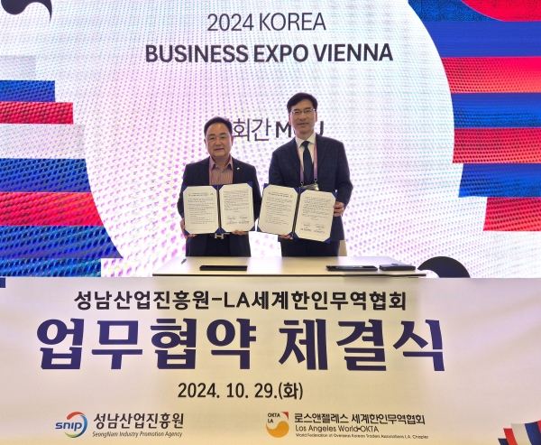 [광성일보] 성남산업진흥원(원장 이의준)은 지난 10월 29일(한국시간 10월 30일) LA 세계한인무역협회(회장 손 에드워드)와 성남 중소벤처기업의 글로벌 경쟁력 강화를 위한 업무협약을 체결했다.지난 10월 28일 세계한인무역협회(월드옥타)에 이은 이번 협약은, 월드옥타 LA의 네트워크를 활용해 성남 기업의 미국 시장 진출 확대를 주목적으로 하고 있다.