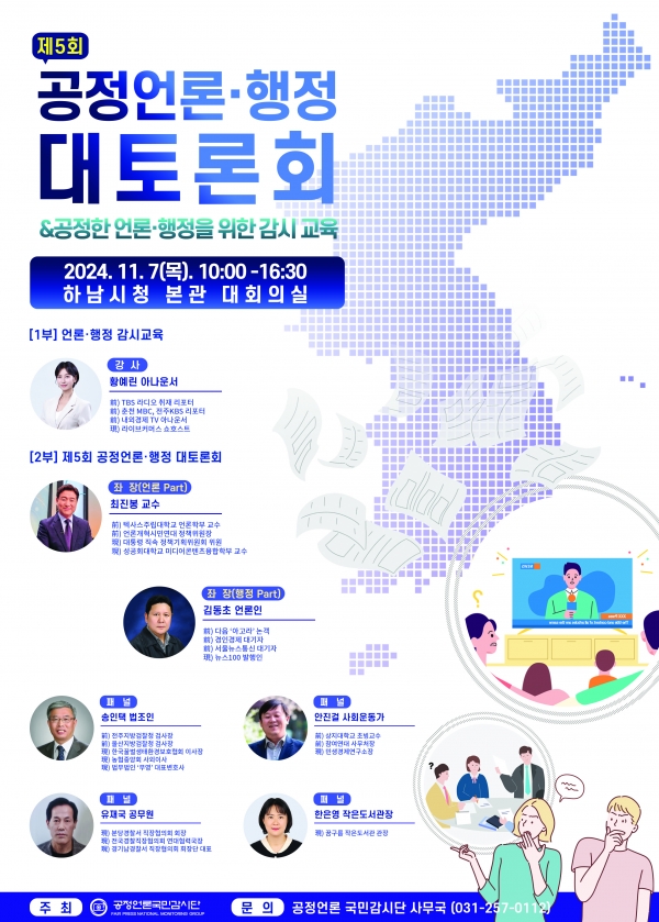 [광성일보]  하남시청 대회의실에서 공익단체 ‘공정언론감시단’이 주최하는 ‘제5회 공정언론·행정 대토론회 및 언론·행정 감시 교육’이 열린다. 이 행사는 오전 10시부터 오후 4시 30분까지 이어지며, 언론과 행정의 투명성 및 공정성 강화에 대한 다양한 교육과 토론으로 구성될 예정이다.이번 대토론회는 언론과 행정의 관계를 논의하고 공정성 확보를 위한 방안을 모색하는 자리로, 일반 국민을 대상으로 한 감시 교육과 언론·행정 전문가들의 참여로 진행된다. 특히 SNS와 뉴미디어의 발전 속에서 언론과 행정의 책임성 강화를 주요 이슈로 다룰 예정으로, 불투명한 언론·행정 관계와 잘못된 정보 전달의 문제를 해결하기 위한 논의가 깊이 있게 펼쳐질 것으로 기대된다.