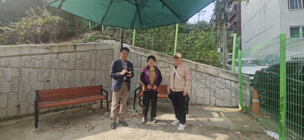 [광성일보] !이군수 시의원(신흥2‧3동·단대동, 더불어민주당)은 11월4일 월요일 우정민 단대동장과 함께 논골 한국유통 뒤에 새롭게 조성한 어르신쉼터 현장을 둘러 보았다.