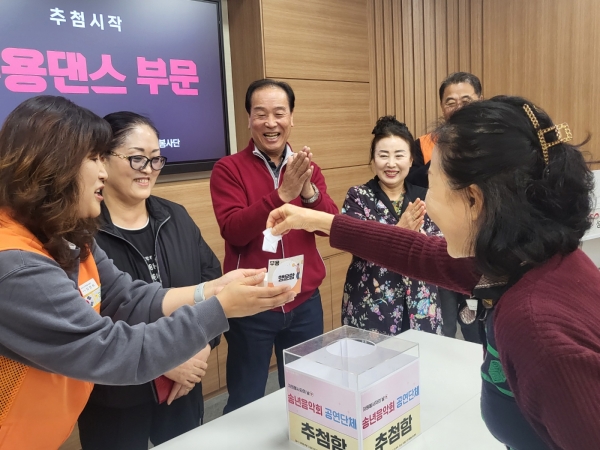 부문별로 신청단체 대표들이 한 명씩 나와 쪽지에 자기 단체이름을 기재해서 투표함에 넣은 다음 참가자들이 미리 정한 순서대로 추첨해서 뽑은 용지를 ‘행운함’(선정)과 ‘수고함’(탈락)에 나눠 넣도록 했다. 몇 번째 용지를 ‘행운함’과 ‘수고함’에 넣을지도 사전에 참가자들이 정했다.발표도 참석자들이 돌아가면서 발표하면서 환호와 박수, 아쉬운 탄식이 섞여 분위기가 한층 고조됐다.이렇게 최종 가요 부문은 7개 단체 중 2개 단체가, 연주곡 부문은 6개 단체 중 2개 단체가, 무용 댄스 부문은 4개 단체 중 1개 단체가, 마지막으로 국악 부문이 3개 단체 중 1개 단체가 각각 선정됐다선정단체는 다음과 같다 ▲ 행복나눔예술봉사단(대표 설백순) ▲ 성남시해바라기회(대표 이홍득) ▲ 중탑앙상블(대표 박금순) ▲조이색소폰(대표 김옥순) ▲ 하모니무용단(대표 김순옥) ▲ 성남시강사협의회 (대표 김보령) 출연단체에게는 각각 50만 원의 출연료가 지원된다.