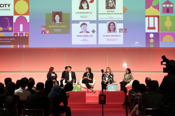 또한, 신 시장은 디지털 격차 해소를 위해 성남시가 추진하고 있는 기술 혁신 정책을 발표했다. AI 로봇을 이용한 소외계층 교육 및 돌봄서비스, 청소년 디지털 중독 해소를 위한 정신건강 AI 체험관 마인드 피트니스 (Mind Fitness) 운영, 드론을 활용한 정밀 열지도 작성, 디지털 리터리시 교육 등 시민 삶의 질 향상을 위한 성남시의 디지털 혁신 정책들을 설명했다. 이날 세션은 미국 비영리단체 리딩시티 제니퍼 제임스의 사회로 진행됐으며, 캐나다 스타트업 대표 재클린 루, 유럽시민 과학프로젝트 폴란드 대사 보그나 가브론스카, 그리고 파이웨어(FIWARE) 재단의 최고운영책임자인 클라라 페수엘라가 패널로 참석했다.이번 세션 발표는 지난 4월 피라 바르셀로나의 우고 발렌티 사장이 성남시의 우수한 스마트시티 기술과 노하우를 높이 평가하며 신 시장을 엑스포 연사로 공식 초청하면서 성사됐다.