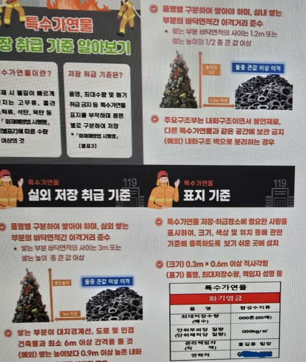 이에 용인서부소방서는 기흥구, 수지구 내 공장·창고 119개 업체에 대해 전수조사를 실시하는 등 화재 예방을 위한 구체적인 대응 방안을 강화할 계획이다.세부 추진 내용으로는 △자원순환관련시설 및 공장·창고시설 전수조사 △관서장 중심 현장 안전 지도 △특수가연물 저장·취급 기준 집중 홍보 등이다.장재구 용인서부소방서장은 “특수가연물은 화재가 발생할 경우 연소 확대가 다른 물질보다 빠르다”며 “이번 화재 예방 대책을 통해 관계자들이 안전 관리의 중요성을 인식하고 보다 철저한 예방 활동이 이루어지도록 할 것”이라고 강조했다.