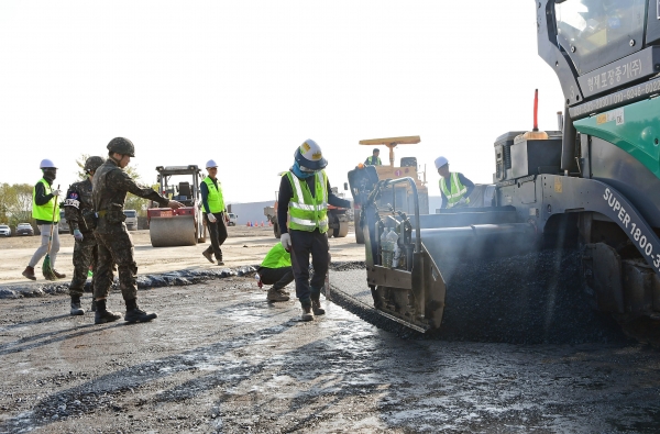 [광성일보] 공군 제15특수임무비행단(이하 ‘15비’)은 11월 13일(수) 기지 내 피해복구훈련장에서 전시 피해복구 능력 향상을 위한 ‘아스콘을 활용 전시 활주로 피해복구 훈련’을 실시했다. 활주로 피해복구는 원활한 항공작전 수행을 지원하기 위한 공병 필수작전이다. 이번 훈련은 동원업체 응소를 통한 전시 활주로 피해복구 절차를 숙달하고, 동원업체와의 공조체계를 점검하기 위해 계획되었다.