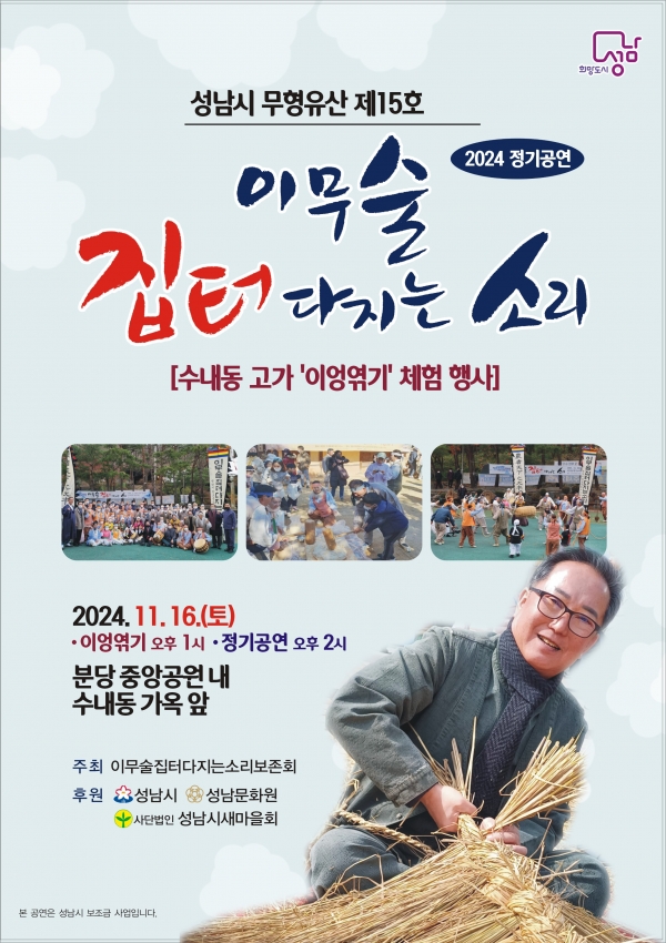[광성일보] 성남지역의 대표 향토 민속놀이인 성남시 향토유산 제15호 ‘이무술집터다지는소리 2024 정기공연’이, 11. 16(토), 분당중앙공원 내 수내동 고가 앞에서 보존회 이사장인 방영기 국가 무형유산 선소리산타령 전승교육사의 총연출로 열린다.제22회 경기도민속예술제에서 최우수상을 수상 한 바 있는, ‘성남이무술집터다지는소리보존회’(이사장 방영기)는, 올해는 정기공연 전 ‘이엉엮기’ 와 ‘떡메치기’ 등 50가족이 함께 체험 행사를 한 후, 이무술 공연의 전 과장인 고사, 동아줄 꼬는 소리, 성토(가래질 소리), 지경다지기(초지경, 양산도타령, 중지경), 방아타령, 휘모리, 서도소리, 뒷풀이 순으로, 또 춤자이예술단, 타악연희단 소리울 풍물패, 경서도무용단의 축하공연도 함께 펼친다.