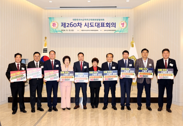 [광성일보] 충청북도 청주시 메리다 웨딩컨벤션에서 대한민국시군자치구의회의장협의회 제260차 시도대표회의가 개최되었다.대한민국의 각 시도 소속 시·군·자치구의회의장협의회장이 참석하는 시도 대표회의의 회의 안건은 주로 각 시도의 시군자치구의회의장협의회를 통과한 안건이 상정된다.경기도 시·군의회의장협의회는 이에 정례회의에서 의결한 안건을 시도대표회의 상정 안건으로 대한민국시군자치구의장협의회에 제출한 바 있다.이날 회의에 참석한 이덕수 회장(현 성남시의회 의장)은 지방의회 자치분권 실현과 자율성 강화를 위한 「지방의회법」 제정을 촉구하는 건의문, 지방의회의 독자적인 감사기구의 설치를 위한 「공공감사에 관한 법률」 개정을 촉구하는 건의문과 「군소음보상법」에 따른 소음피해의 합리적 보상 및 지원을 위한 건의문 채택의 건을 발의하였다.