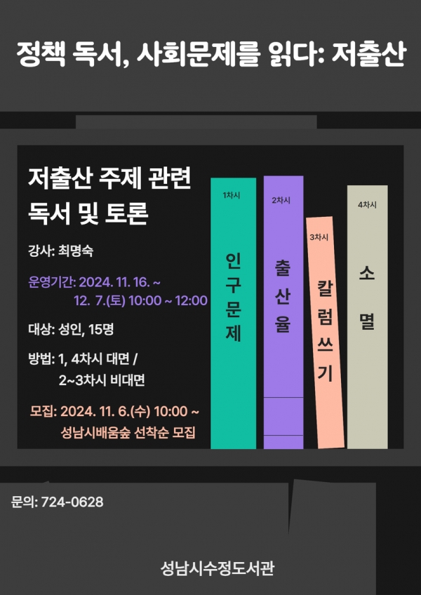 [광성일보] 성남도시개발공사(사장 박민우, 이하 공사) 수정도서관은 오는 16일부터 다음달 31일까지 ‘정책 독서, 사회문제를 읽다: 저출산’ 프로그램을 운영한다고 15일 밝혔다.