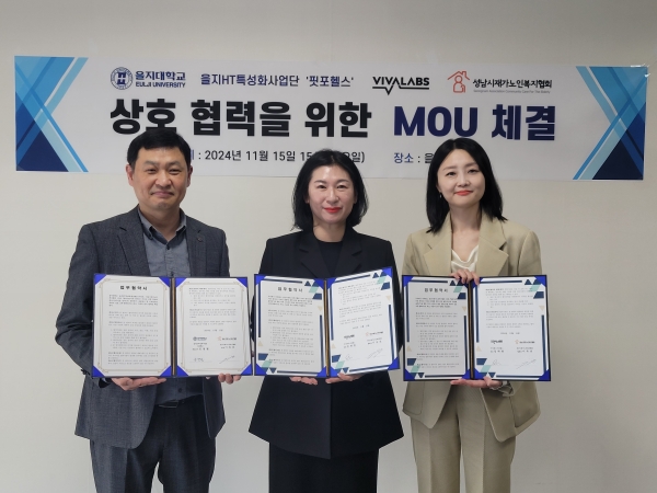 [광성일보] 2024년 성남시재가노인복지협회(회장 이유진)는 어르신 건강 특성화 분야의 공동 연구와 전공 봉사, 인재 양성을 위한 상호 교류 협력을 목적으로 핏포헬을지대학교 을지HT특성화사업단스(교수 김명철)과 (주)비바랩스(대표 임하영)와 함께 업무 협약을 체결하였습니다.