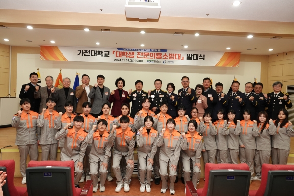 [광성일보] 성남소방서(서장 홍진영)는 가천대학교(총장 이길여) 글로벌센터 국제홀 1층에서 ‘가천대학교 대학생 전문의용소방대 발대식’ 행사를 개최했다고 19일 밝혔다.이번 발대식은 소방 지원 활동에 헌신·봉사할 젊고 유능한 대학생 인적자원 구축을 위해 추진되었는데 전문의용소방대원으로 가천대학교 설비·소방공학과 1~4학년 재학생 중 25명(남12, 여13)으로 구성되었다.
