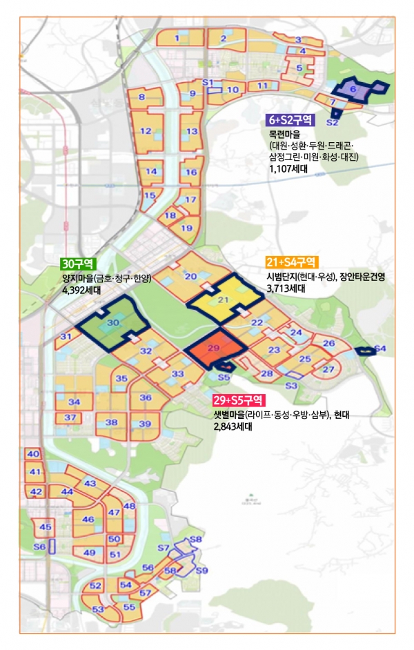 선도지구로 선정된 아파트 유형은 ▲기초구역29,S5(샛별마을 라이프‧동성‧우방‧삼부, 현대/2843세대), ▲기초구역30(양지마을 금호‧청구‧한양/4392세대), ▲기초구역21,S4(시범단지 현대‧우성, 장안타운건영/3713세대)이며, 유형별 안배를 고려하여 별도 정비물량으로 선정된 연립주택 유형은 ▲기초구역6,S2(목련마을 대원‧성환‧두원‧드래곤‧삼정그린‧미원‧화성‧대진/1107세대)이다.이번 공모는 국토교통부가 지난 5월 발표한 ‘1기 신도시 선도지구 선정계획’에 따라 노후화된 1기 신도시 내 가장 먼저 정비할 대상지를 선정하기 위해 진행됐으며, 동의서 검증, 평가위원회 개최, 국토부 협의 등을 거쳐 최종 선정됐다. 평가 과정에서 동의자와 소유자의 불일치, 관련 서류 제출 미비 등 동의서 요건을 충족하지 못한 경우에는 무효 처리되거나, 평가기준에 위배되는 항목에 대하여 감점되는 등 일부 구역의 자기평가 점수가 조정됐다.