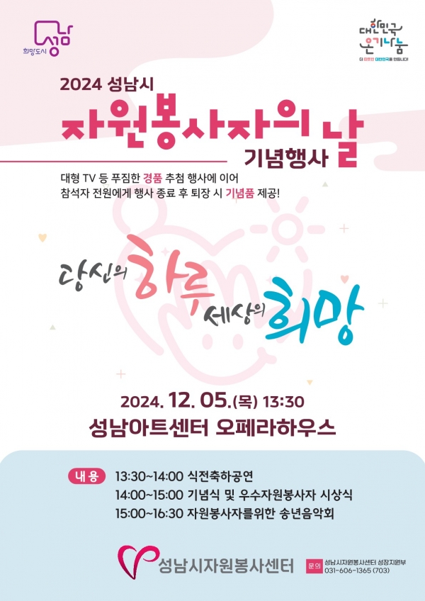 [광성일보] 성남시 자원봉사센터는 한해를 마감하면서 헌신적 봉사활동을 펼쳤던 자원봉사자들에 대한 노고를 격려하고, 자원봉사자 간 교류와 화합으로 자원봉사 문화 활성화를 도모하기 위한 ‘2024 성남시 자원봉사자의 날 기념행사’가 다음 달 5일, 성남아트센터 오페라하우스에서 열린다.세계 자원봉사자의 날(12월 5일)에 맞춰 열리는 기념행사는 오후 1시 30분부터 성남시립예술단이 공연하는 식전 특별공연을 시작으로 2시부터 기념식과 자원봉사활동 유공자에 대한 시상식이 열리고, 2부 순서로 성남시자원봉사센터에 등록된 예술 부문 자원봉사 단체들이 펼치는 음악과 춤의 향연이 이어진다.