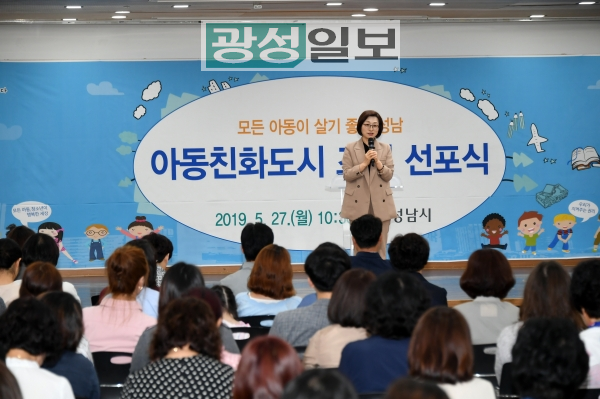 성남시(시장 은수미)는 5월 27일 오전 시청 한누리에서 ‘아동친화도시 조성 선포식’을 개최했다.시민 200여 명 앞에서 은수미 성남시장이 아동친화도시 조성을 공식 선포하고, 성남시청소년행복의회 의장·부의장인 고등학생 2명이 대표로 나와‘아동권리헌장’을 낭독했다.