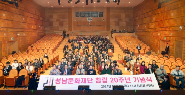 [광성일보] 성남문화재단(대표이사 서정림)이 창립 20주년을 맞아 2일(월) 오후 3시 성남아트센터 앙상블시어터에서 기념식을 개최했다.이날 행사에는 이진찬 성남시 부시장, 이덕수 성남시의회 의장, 성남시의회 문화복지체육위원장 및 의원과 한국문화예술위원회 정병국 위원장을 비롯한 문화예술계 인사, 출연기관과 유관기관 대표, 성남문화재단 직원 등 300여 명이 참석해 재단의 창립 20주년을 축하했다.퓨전밴드 AUX의 공연으로 문을 연 이날 기념식은 영상으로 지난 20년의 발자취를 돌아본 후 앞으로의 다짐을 공유하는 자리로 이어졌다.