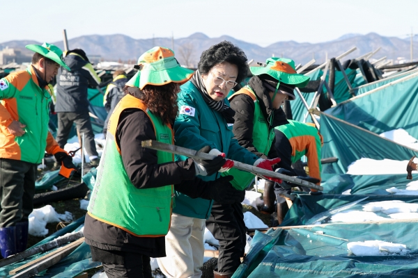 이번 활동은 폭설로 인해 눈의 무게를 이기지 못해 인삼밭의 지붕이 내려앉아 작물이 손상되는 등 심각한 피해를 입은 농가를 대상으로 진행됐다. 자원봉사자들은 영하의 날씨 속에서도 무너진 시설물 정리와 잔해물을 치우는 작업에 구슬땀을 흘렸다.김경희 시장은 “폭설 피해로 어려움을 겪는 농가에 깊은 위로의 말을 전하며 복구를 위해 여러 단체가 한마음으로 참여해줘 감사하다”라며 “앞으로도 이천시는 심각한 피해를 입은 농가의 신속한 복구와 자연재해로부터 빠르게 회복할 수 있도록 지원을 아끼지 않겠다”라고 전했다.