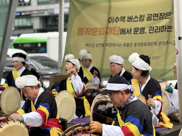 [광성일보] 사회복지법인 따뜻한동행 사당어르신종합복지관(관장 조희정)에서는 이수역 버스킹 공연장에서 지역주민을 대상으로 풍물공연을 진행하였다.11월 29일(금)에 진행된 지역사회공연은 어르신들이 수강하신 풍물교육을 기반으로 하여 장구, 꽹과리, 징, 북과 같이 다양한 풍물악기를 활용한 공연을 진행하였다. 날이 춥고 궂은 날씨임에도 어르신들의 흥겨운 국악 장단에 덩실덩실 춤을 추며 걸어가는 학생, 박자에 맞춰 박수로 응원을 전한 젊은 연인들과 같이 공연장 일대를 지나가는 행인들을 비롯해 공연을 관람하는 지역주민들에게 웃음과 흥겨움을 전하며 지역사회에 따뜻함을 나눴다.