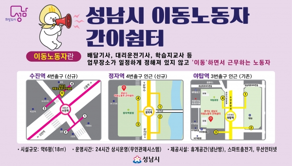 시는 올해 1월 야탑역에 첫 간이쉼터를 설치한 데 이어, 이번에 수진역과 정자역 광장에 추가로 쉼터를 조성해 관내 간이쉼터를 총 3곳으로 확대했다. 이는 경기도 내에서 가장 많은 수치로, 이동노동자를 위한 적극적인 지원 정책의 일환이다.이동노동자 간이쉼터는 플랫폼 시장의 급성장으로 이동노동자가 증가하며 휴식 공간 마련의 필요성이 제기되어, 2022년 10월 민선 8기 공약사업으로 선정·추진됐다. 쉼터 내부에는 냉난방 시스템, 무선 인터넷, 스마트폰 충전기 등 편의시설을 갖추고 있으며, 심야 시간대에도 활동하는 이동노동자를 위해 연중무휴 24시간 운영된다. 보안과 안전 강화를 위해 무인 경비시스템과 출입 인증 보안시스템도 도입했다.