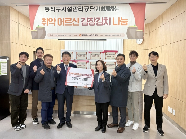 [광성일보] 사회복지법인 따뜻한동행 사당어르신종합복지관(관장 조희정)은 동작구시설관리공단(이사장 김진우)으로부터 김장김치 35박스를 지원받았다. 이번 지원은 지역사회 내 취약 어르신들의 행복한 효도밥상 사업을 돕기위해 진행되었으며, 지역사회 따뜻한 나눔정신을 실천하는 기회가 되었다.동작구시설관리공단은 사회공헌활동의 일환으로 지역사회 취약어르신들의 결식예방을 위해 지속적인 나눔을 이어오고 있다.