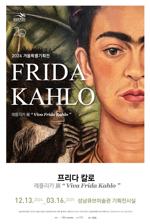 [광성일보] 성남문화재단(대표이사 서정림)이 20세기를 대표하는 여성화가 프리다 칼로의 삶과 예술을 다룬 특별기획전 ‘비바! 프리다 칼로>’ 레플리카 전시를 오는 12월 13일(금)부터 2025년 3월 16일(일)까지 성남큐브미술관 기획전시실에서 개최한다.성남문화재단과 전시공간기획사 디자인 믿음이 공동주최하는 이번 전시는 멕시코 미술의 국보급 화가이자 세계적으로 가장 사랑받는 여성화가 프리다 칼로의 예술세계와 삶을 조명한 전시다.