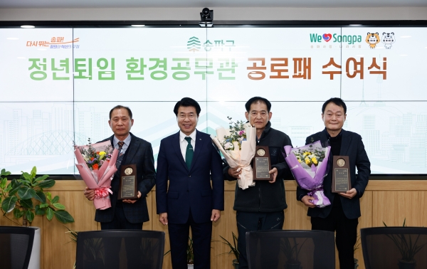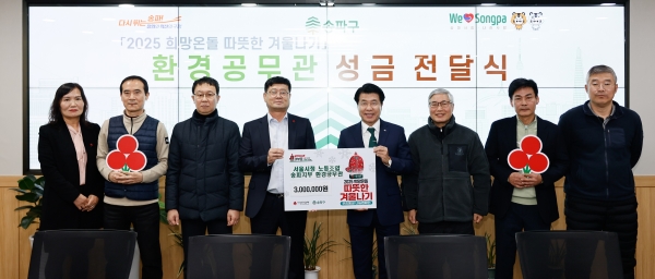 지난 11일 구청에서는 환경공무관 10명이 손수 모금액을 전하는 성금 전달식이 열렸다. 이날 모인 성금은 서울사회복지공동모금회에서 저소득 장애인, 한부모가족, 홀몸어르신 등 취약계층을 위해 사용된다.이어서, 정년퇴임 예정 환경공무관 4명을 위한 공로패 수여식이 있었다. 이들은 재직기간 최장 16년에 이르는 베테랑으로 지난 11월 낙엽 처리비용 절감과 지역 상생을 위해 관내 은행잎을 수거해 남이섬으로 직접 옮긴 주인공이다.서강석 송파구청장은 “깨끗한 도시환경을 위해 10년 이상 불철주야 애써주신 분들께 감사드리며, 새로운 인생 제2막을 응원한다”라고 감사 인사를 전했다. 퇴직예정자들 역시 “보람을 느끼며 일했다. 퇴임식을 마련해 준 구에 감사드린다”라고 화답했다.