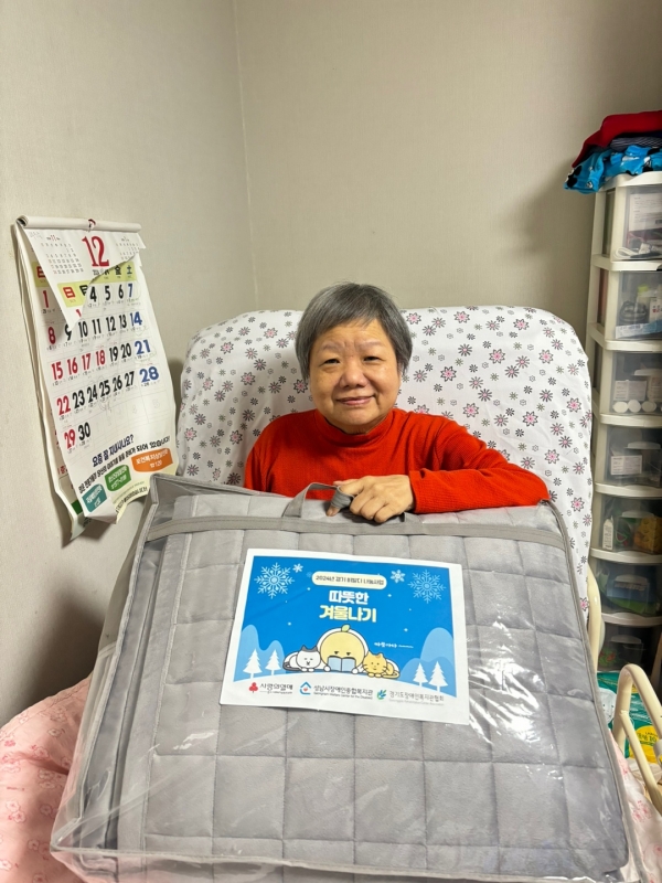 “사계절 사랑나눔” 세 번째 사업인 ‘따뜻한 겨울나기’는 기후변화의 영향으로 혹한기를 보내는 성남시 관내 저소득 장애인 20가구를 대상으로 진행되었으며, 가정 방문을 통해 안부를 확인하고 극세사 침구류 세트를 지원하여 난방비를 절감하고 보온효과를 높이는 등 안전하고 건강한 겨울나기를 지원하기 위한 사업이다.