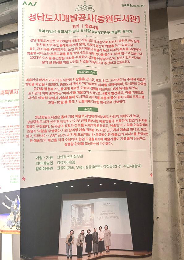 이번 사업은 전국 168개 기업·기관이 참여했으며, 중원도서관의 우수사례는 앞서 6일 서울 용산구 케이브하우스에서 열린 ‘예술로 성과공유회’에서 전시됐다.