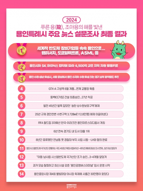 [광성일보] 2024년 용인특례시를 빛낸 최고의 뉴스로 ‘세계적 반도체 장비 기업들 속속 용인으로…램리서치, 도쿄일렉트론, ASML 등’이 선정됐다. 시민들은 이어 ‘용인시와 SK 하이닉스 협약에 따라 4500억 규모 지역 자원 활용키로’를 2위 뉴스로 꼽았다.용인특례시(시장 이상일)는 13일부터 18일까지 6일간 시민과 출입 기자, 공직자를 대상으로 올해 주요 뉴스를 선정하는 온라인 설문조사 결과 이같이 나왔다고 24일 밝혔다.설문조사에는 총 6070명이 참여했다. 주요 뉴스 선정은 참여자들이 29개의 후보 뉴스 중 5개를 선택해 가장 많은 표를 받은 순으로 순위를 1위부터 14위까지 매기는 방식으로 진행됐다.올해의 주요 뉴스에는 반도체 중심 도시로 나아가는 용인특례시의 위상에 걸맞게 반도체 관련 뉴스가 상위에 올랐다.1위로 뽑힌 뉴스는 ‘세계적 반도체 장비 기업들 속속 용인으로…램리서치, 도쿄일렉트론, ASML 등’으로 2420표를 받았다. 이어 ‘용인시와 SK하이닉스 협약에 따라 4500억 규모 지역 자원 활용키로’가 2248표를 받아 2위에 이름을 올렸다.