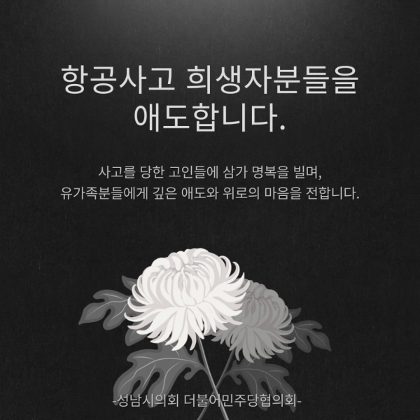 성남시의회 더불어민주당협의회(이하 협의회)는 전남 무안국제공항에서 발생한 여객기 사고 희생자와 유가족에 깊은 애도를 표하였다.