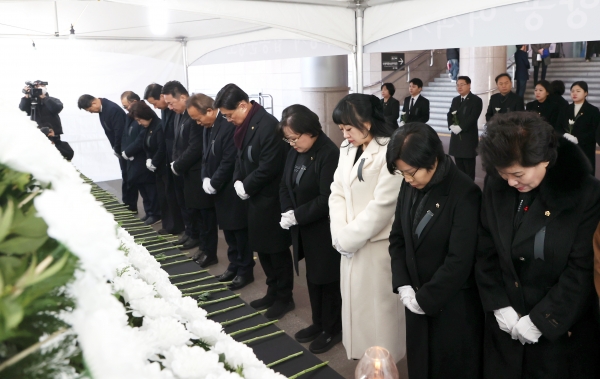 [광성일보] 성남시의회 이덕수 의장, 안광림 부의장, 정용한 국민의힘 대표의원, 이준배 더불어민주당 대표의원을 비롯한 성남시의회 의원들이 제주항공 여객기 참사 희생자를 애도하기 위해 31일 수원역사 로비 인근에 마련된 합동분향소를 방문하여 참사 희생자들을 추모했다.