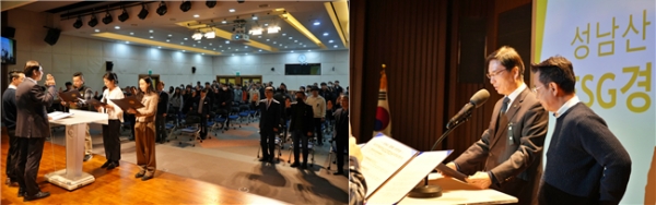 [광성일보] 성남산업진흥원(원장 이의준)은 2일 2025년 시무식에서 ESG경영 선포식을 갖고 지속가능한 미래를 위한 기관 운영 의지를 표명했다.선포식에서 임직원들의 ‘지역 경제 활성화와 산업경쟁력 강화를 위한 책임 있는 경영 실천’을 선서하였고, 관내 기업 대상 ESG경영 전파에도 노력하기로 하였다.ESG경영 도입은 진흥원이 글로벌 산업환경에 대응하고 기업과 함께 해외 시장 진출을 강화하는데도 전환점이 될 것으로 기대된다.