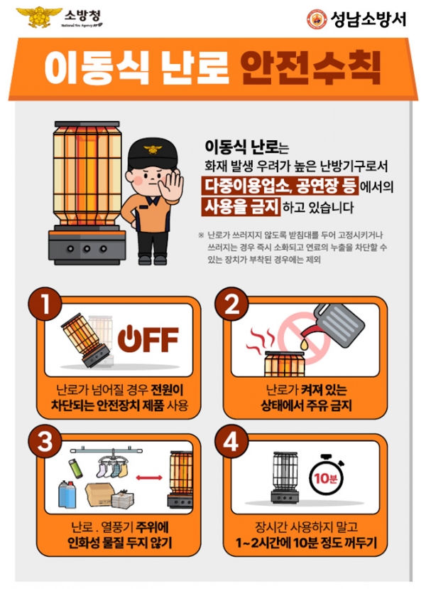 성남소방서(서장 홍진영)는 겨울철 이동식 난로 사용 시 안전수칙 준수 당부