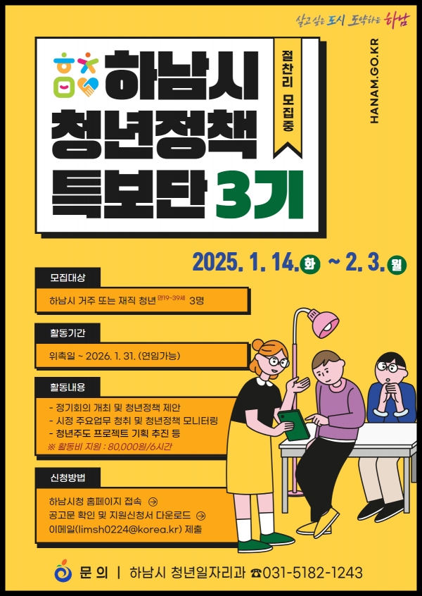 ‘청년메이트’라는 별칭으로도 알려진 청년명예시장과 청년정책특보단은 1년 임기(2회 연임가능)로 활동하며, 시정 현안 청취 및 모니터링, 청년 의견 수렴 및 정책 홍보 등 역할을 수행해왔다.제1기 청년메이트 발족 이후, 제2기 특보단은 기존 구성원의 연임으로 운영되었으며, 올해는 보다 다양한 청년의 목소리를 듣고자 권역별로 충원하여 제3기를 구성한다.이번에 모집하는 인원은 정책특보 3명으로, 하남시에 거주하거나 재직 중인 19~39세 청년이면 누구나 지원할 수 있다. 지원을 희망하는 청년은 2월 3일까지 지원신청서를 작성해 이메일(limsh0224@korea.kr)로 제출하면 된다.제3기 청년정책특보단으로 선발되면 2026년 1월 31일까지 활동하게 되며, 정기회의를 통한 청년 관련 의제 발굴, 지역 청년 간 네트워킹 등의 역할을 하게 된다.