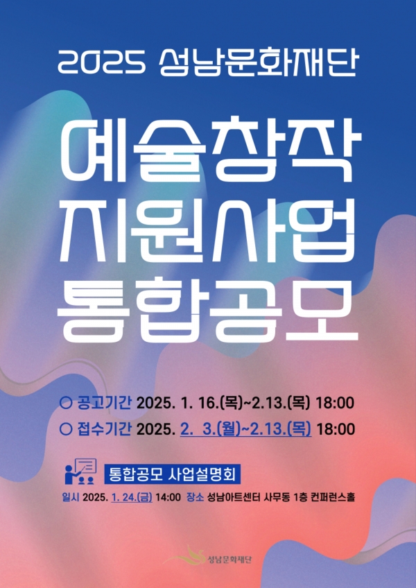 성남문화재단 서정림 대표이사는 “재단의 예술창작지원을 통해 지역 예술인들이 더욱 안정적으로 창작활동을 이어가길 바란다”면서 “앞으로도 예술인들의 창의적 아이디어가 성남의 문화적 자산으로 자리 잡으며 지속가능한 예술 생태계를 조성하도록 노력할 것”이라고 밝혔다.‘모든예술 31’과 청년예술활동 지원사업 중 ‘예비예술인 성장 지원 프로젝트’를 제외한 모든 공모는 오는 2월 13일(목)까지 접수하며, 1월 24일(금) 오후 2시부터 성남아트센터 사무동 1층 컨퍼런스홀에서 통합공모 관련 사업설명회를 진행한다.각 공모별 지원 자격 및 신청 방법 등 자세한 사항은 성남문화재단 홈페이지(www.snart.or.kr)를 참고하거나, 성남문화재단 예술창작지원부(031-783-8122~23, 8125~26)로 문의하면 된다.