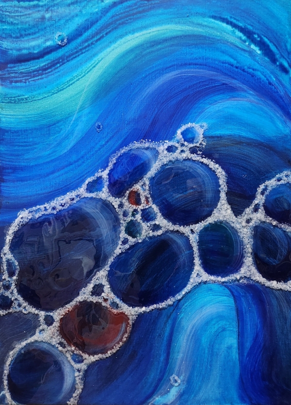 작가는 프랑스 국립대학 중에 예술분야에서 명성이 높은 파리8대학 예술학 석사, 박사과정 수료하고 회화와 설치미술 작품으로 프랑스에서 20여년 이상 활동한 재불 작가로 현재는 암염(돌소금)을 오브제로 활용한 창작품으로 한국에서 전시 활동을 왕성하게 진행 중에 있다. 바다 위에 떠다니는 물거품의 형상은 번뜩이는 작품의 소재로 연결되었으며, 햇볕 받은 물거품 얇은 막에 구현되는 오묘한 색상들을 회화적으로 풀어냈다.영롱한 물빛의 생기 넘치는 장면을 표현하기 위해 물감과 암염(돌소금)의 융복합적인 조화로움이 작품성을 높인다. 또한 암염(돌소금)에 투영된 빛을 표현하기 위해 크고 작은 돌소금 알갱이 들을 붙이고 물방울에는 크리스탈화 작업으로 빛의 효과를 극대화시켜 신비스러운 이미지를 연출해 냈다. 푸른 물결 위를 떠다니는 물방울의 자유로움은 순수와 청명함까지 추가되어 자신이 주체가 되고자 하는 인간의 삶을 은유적으로 이야기 한다.