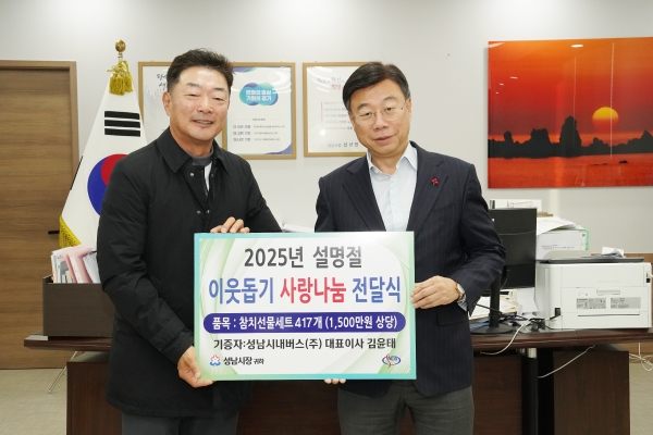 [광성일보] 성남시(시장 신상진)는 설 명절을 앞두고 지역 버스회사들의 이웃사랑 실천이 이어지고 있다고 23일 밝혔다.중원구 상대원동에 위치한 성남시내버스는 22일 설 명절을 맞아 1500만원 상당의 참치 선물세트를 성남시에 기탁했다.성남시내버스(대표이사 김윤태)는 34개 노선에 394대의 시내·광역버스를 운행하고 있으며, 2019년부터 현재까지 쌀, 상품권, 선물세트 등 약 1억4000만원 상당의 물품을 기탁하며 활발한 사회공헌활동을 이어가고 있다.