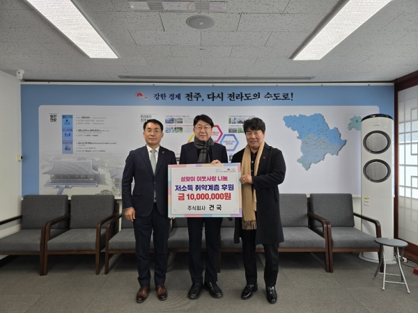 [광성일보] ㈜건국(대표 이재수)은 24일 설맞이 이웃사랑 나눔 성금 1000만 원을 전주시에 전달했다. 이날 기탁받은 성금은 경제적 어려움을 겪고 있는 이웃들에게 실질적인 도움을 줄 수 있도록 전달될 예정이다. 이재수 ㈜건국 대표는 “설 명절을 맞아 어려운 이웃들에게 작은 보탬이 되고자 기부를 결심했다”면서 “앞으로도 지역사회를 위한 다양한 사회공헌활동을 이어나가겠다”고 밝혔다.