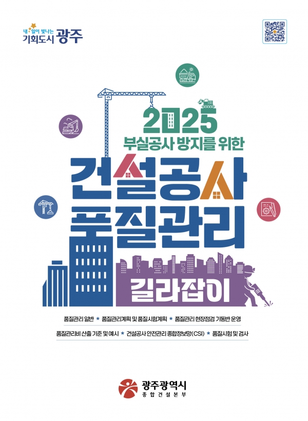 [광성일보] 광주광역시(시장 강기정)는 건설공사의 품질 향상과 안전사고 예방을 위한 업무지침서인 ‘건설공사 품질관리 길라잡이’를 발간, 무료 배포한다.이번 업무지침서는 전국 최초로 광주시가 구성한 ‘민관합동 건설공사 품질혁신기획단 전문가들과 2024년 광주지역 건설공사의 품질향상에 기여한 우수 현장 기술자(감리단장·현장소장·품질실장), 공무원들이 함께 논의한 결과물이다.건설공사의 품질관리 업무를 수행하고 있는 발주청 및 인·허가기관 공무원들과 발주자·감리자·시공자 등 건설공사 관계자들이 실무형 교재로 활용할 수 있도록 관련법령, 현장점검요령, 질의응답 등을 체계적으로 정리했다.