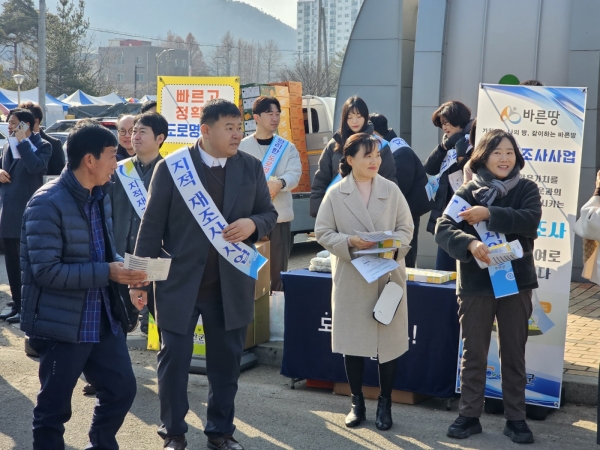 [광성일보] 전남 무안군(군수 김산)은 설 명절을 맞이해 지난 24일 무안전통시장을 찾아 지역 주민들과 시장 방문객들을 대상으로 지적재조사사업 및 도로명주소 합동 홍보를 진행했다.이번 홍보에서는 주민들의 재산권 행사·보호 및 일상생활과 밀접한 관련이 있는 지적재조사사업과 도로명주소에 대하여 보다 많은 사람이 쉽게 이해하고 접할 수 있도록 다양한 홍보 물품을 나눠줬다.