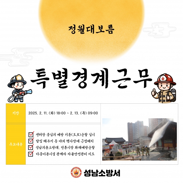 [광성일보] 성남소방서(서장 홍진영)는 정월 대보름을 앞두고 2월 11일 오후 6시부터 2월 13일 오전 9시까지 3일 동안 특별경계근무를 실시한다고 밝혔다.이번 특별경계근무는 정월 대보름 기간에 달집태우기, 쥐불놀이, 풍등으로 인한 화재 등 각종 사고에 대비하고, 재난 발생 시 신속한 초기 대응체계 구축을 위해 마련되었다.