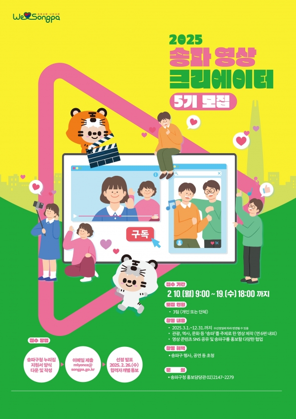 먼저, 「제9기 송파구 블로그기자단」은 송파구에 관심 있는 만 19세 이상 대한민국 국민 누구나 지원할 수 있으며, 16명을 선발한다. 특히, 올해는 송파의 아름다운 모습을 사진으로 소개할 사진기자도 모집한다.선발된 기자단은 오는 3월부터 12월까지 활동하며, 선정 기사는 송파구청 대표 블로그, 카카오톡 채널 등 SNS에 게재되고 소정의 원고료를 지급한다. 또, 우수 활동 기자에게는 표창도 수여된다.신청은 2월 18일(화)까지 송파구 공식 블로그에서 양식을 다운받아 작성 후 담당자 이메일(shu429@songpa.go.kr)로 제출하면 된다. 결과는 2월 26일(수)에 송파구 블로그 및 개별문자로 발표할 예정이다.한편, 「제5기 송파영상크리에이터」는 송파구의 다양한 면모를 창의적인 영상으로 표현할 수 있는 인재를 모집한다.구는 2020년부터 5년간 '송파 영상크리에이터' 운영을 통해 송파의 정책과 문화‧생활정보를 개성 넘치는 141편의 영상 콘텐츠로 선보이며 주목받고 있다.