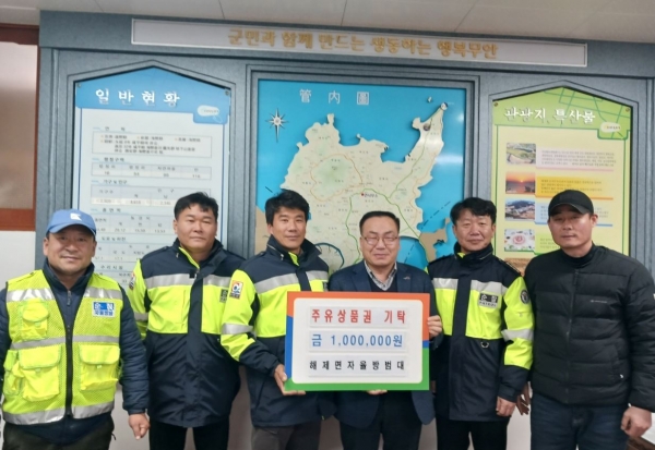 [광성일보] 무안군 해제면(면장 박성서는) 해제면 자율방범대(대장 주현종)에서 지난 6일 주유상품권 100만원을 해제면에 기탁했다고 밝혔다.이날 전달된 상품권은 지속적인 한파로 추운 겨울을 보내고 있는 지역 내 취약계층을 위해 자율방범대 대원들이 정성을 모아 마련했으며, 해제면는 주유상품권을 난방에 어려움을 겪는 지역 내 장애인, 독거노인 4가구를 선정해 전달할 예정이다.