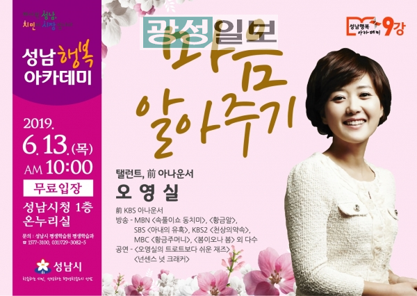 오영실 전 아나운서는 홍익대 금속공예과를 졸업하고 KBS 공채 아나운서를 거쳐 현재는 배우로 전향해 활동하고 있다. 주요 출연작으로 MBN ‘속풀이쇼 동치미’, SBS ‘아내의 유혹’, KBS2 ‘천상의 약속’, MBC ‘황금주머니’ 등이 있다.성남행복아카데미 강연을 듣고자 하는 시민은 별도 신청 절차 없이 행사 당일 선착순 입실하면 된다.