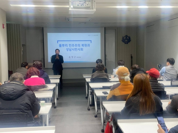 [광성일보] 윤창근 성남비상행동 공동대표는 지난 13일 오후 7시 주민신협 커뮤니티 회의실에서 성남비상행동 회원 50여명이 참석한 가운데 사회대개혁 세미나로 성남시정 평가와 대안 마련을 위해 ‘풀뿌리 민주주의 복원과 성남시민사회’란 주제로 지방자치, 성남 거버넌스 변화, 신상진 시정부 평가, 성남 풀뿌리 민주주의 복원 순으로 강연을 펼쳤다.윤 공동대표는 20년 간 성남시 행정을 이끈 행정가이며 정치인으로 성남시의회 의장을 역임한 지방정부 전문가로 통한다.윤 대표는 “민선 8기가 과연 온전한 풀뿌리 민주주의인가? 지방자치는 민주주의를 위한 더 이상 좋을 수 없는 학교이며, 민주주의 성공을 보장받을 수 있는 가장 확실한 보증이다. 성남 거버넌스는 파괴되어 거버넌스 복원은 정권교체, 의회 다수당, 생태계 구축으로 가능하다”면서 “향후 민선 9기는 통합형 거버넌스 구축이 필요하다”고 강조했다.