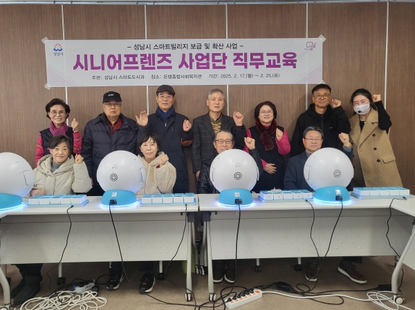 이번 사업은 성남시가 2024년부터 추진 중인 ‘스마트빌리지 보급 및 확산 사업’의 활성화를 위해 마련된 것으로, 어르신들에게 적합한 일자리를 제공하는 동시에 경로당 내 스마트기기 활용도를 높이는 것을 목표로 한다.현재 성남시의 100여개 스마트경로당에는 인지훈련 로봇과 화상교육 시스템이 설치되어 있지만, 이를 효과적으로 운영할 인력이 부족하여 충분히 활용되지 못하고 있다. 이에 성남시는 시니어프렌즈 사업단을 통해 경로당 어르신들에게 1:1 스마트기기 교육을 제공하고, 기기 점검 및 간단한 문제 해결을 지원하여 보다 원활한 운영을 돕는다.성남시는 시니어프렌즈 사업단의 원만한 업무 수행과 스마트기기 활용 역량 강화를 위해 2월 17일부터 27일까지 인지훈련 로봇 및 화상교육 시스템 사용법 등을 포함한 직무교육을 실시했다. 사업단은 3월부터 경로당을 순회하며 스마트기기 교육과 운영 지원 업무를 담당하게 된다.