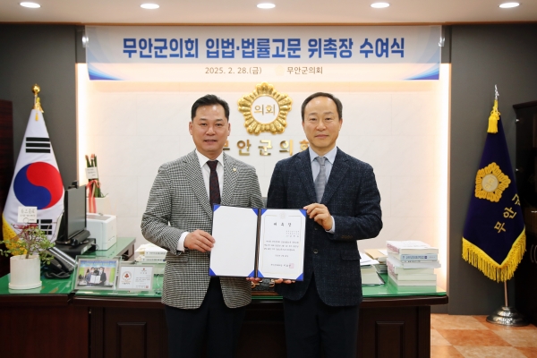 새로 위촉된 입법 고문은 김병도 소장(한국산업기술원 자치법규연구소), 홍봉주 변호사(H&P법률사무소)로 앞으로 무안군의회의 입법 활동 및 법률적 검토를 지원할 예정이다.이호성 의장은 “지방자치법 개정과 법률 환경 변화에 대응하기 위해 전문적인 법률 자문이 더욱 중요해지고 있다”며, “입법·법률 고문들의 풍부한 경험과 전문성이 무안군의회 의정활동의 내실을 다지는 데 큰 도움이 될 것으로 기대한다”고 말했다.한편, 무안군의회는 지속적으로 법률적 전문성을 보강하여 효율적인 정책추진과 신뢰받는 의정활동을 펼쳐나갈 계획이다.