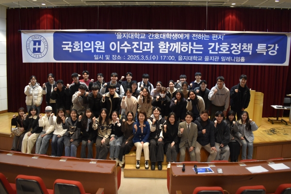 [광성일보] 사진설명: 이수진 국회의원이 을지대학교에서 간호대학 학생들을 대상으로 간호정책 특강을 마치고 기념촬영을 하고 있다.을지대학교(총장 홍성희)는 더불어민주당 이수진 국회의원(성남시 중원구)을 초청, 을지대 간호대학 학생들을 대상으로 간호정책 특강을 가졌다고 6일 밝혔다.이번 특강은 간호학과 학생들이 보건의료 분야의 정책적 흐름을 이해하고, 미래의 간호 전문가로서 필요한 정책적 소양을 쌓을 수 있도록 돕기 위해 마련됐다.