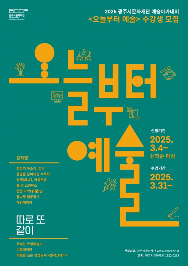 [광성일보] (재)광주시문화재단은 오는 4월부터 6월까지 2025 예술아카데미 <오늘부터 예술>을 운영한다고 밝혔다. 수강생 모집은 3월 4일부터 선착순으로 진행된다. 2025 예술아카데미는 다양한 문화예술 분야의 전문교육을 제공하는 교육 프로그램으로 작년 한 해 호응이 높았던 예술 실기 기반의 강좌뿐 아니라 새롭게 신설된 어린이 강좌까지 총 10개의 프로그램을 제공할 예정이다.
