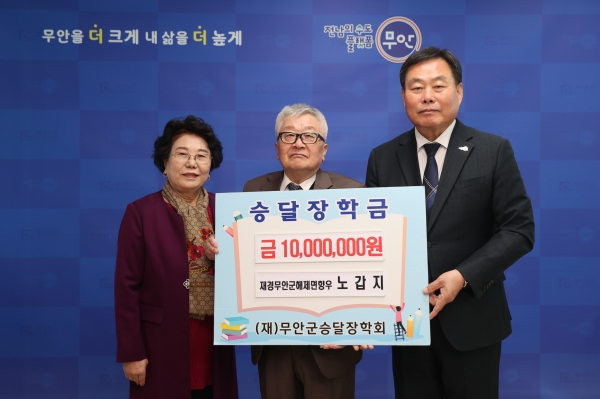 [광성일보] 전남 무안군(군수 김산)은 12일 재경무안군해제면 향우 노갑지 씨가 (재)무안군 승달장학회에 지역인재 육성을 위한 장학금 1,000만원을 기탁했다고 밝혔다.노갑지씨는 무안군 해제면 덕산리 출신으로 자수성가하여 지난 2017년에는 승달장학회에 1억원을, 올해 1월에는 고향사랑기부금 1백만원을 기탁하는 등 고향에 대한 남다른 애정을 보여주었고, 2024년 ‘무안군민의 상’을 수상하기도 했다.